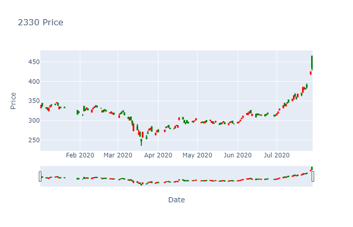 台積電股價昨天(2020/07/27)破新高後,今天賣壓出籠 今天來用Python 來畫出台積電的股價K線圖: