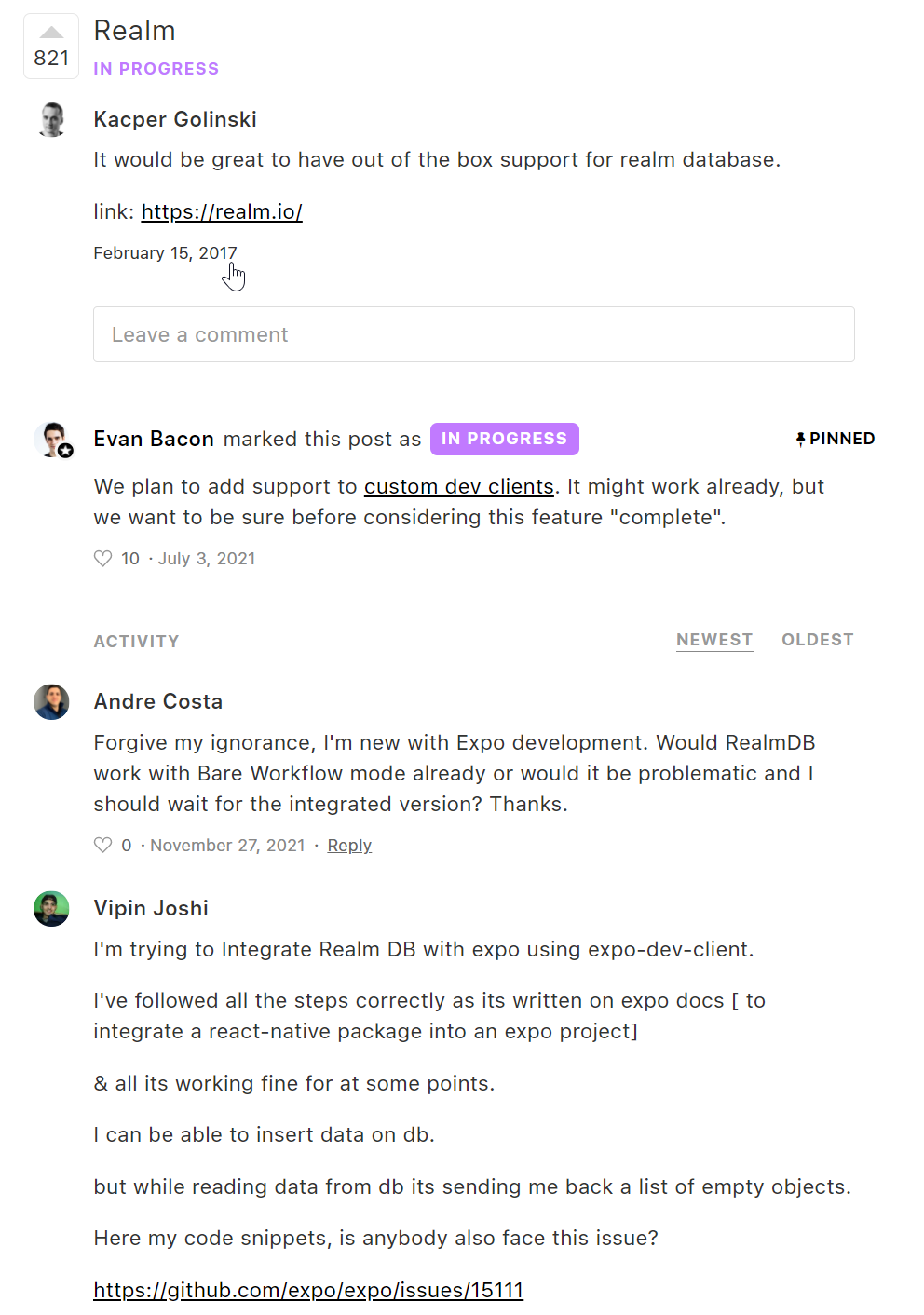 有人從2017年初就敲碗要求EXPO把realm納入支援...直到我發文的現在 還有一些issue未解,如果用原生的react-native cli 就沒這問題...