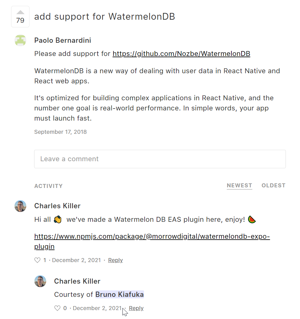 反觀一個我之前聽都沒聽過的西瓜資料庫,2018年九月有人敲碗 現在已經有支援這個西瓜了...realm的使用者應該遠大於西瓜...到底???